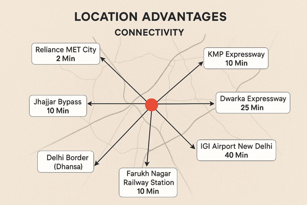 Located just minutes away from key landmarks, Krishan Kunj offers unmatched accessibility. It is only 2 minutes from Reliance MET City, 5-minute drive from the Jhajjar-Gurugram Highway, and 10 km from the KMP Expressway. Moreover, it is just 22 km from the Dwarka Expressway. This strategic location makes it an ideal investment for anyone looking for a plot in a growing area with excellent connectivity to major highways.